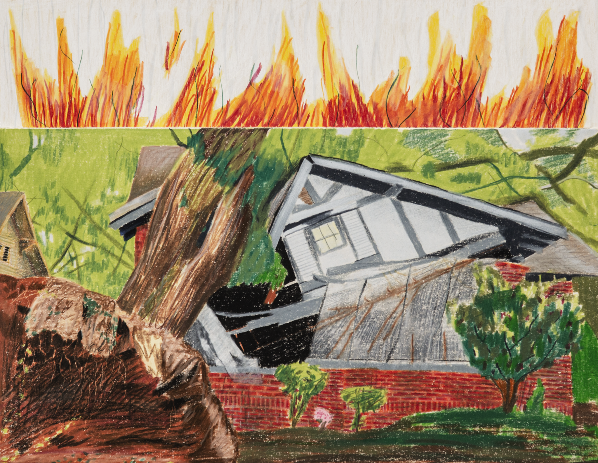 His pieces demonstrate how life extends beyond its own subjective limits and often tells a story about the nature of death. It challenges the binaries we continually reconstruct between existence and the absence thereof. By exploring the concept of landscape and object-portraiture in a destructive way, he investigates their dynamics, including the manipulation of the works effects and the limits of spectacle based on our assumptions of what these types of images mean to us. By presenting forests, houses and cars which are in the process of being destroyed, he proposes the idea that by removing the primary function from an object, we are left with an artwork, a sort of reincarnation.