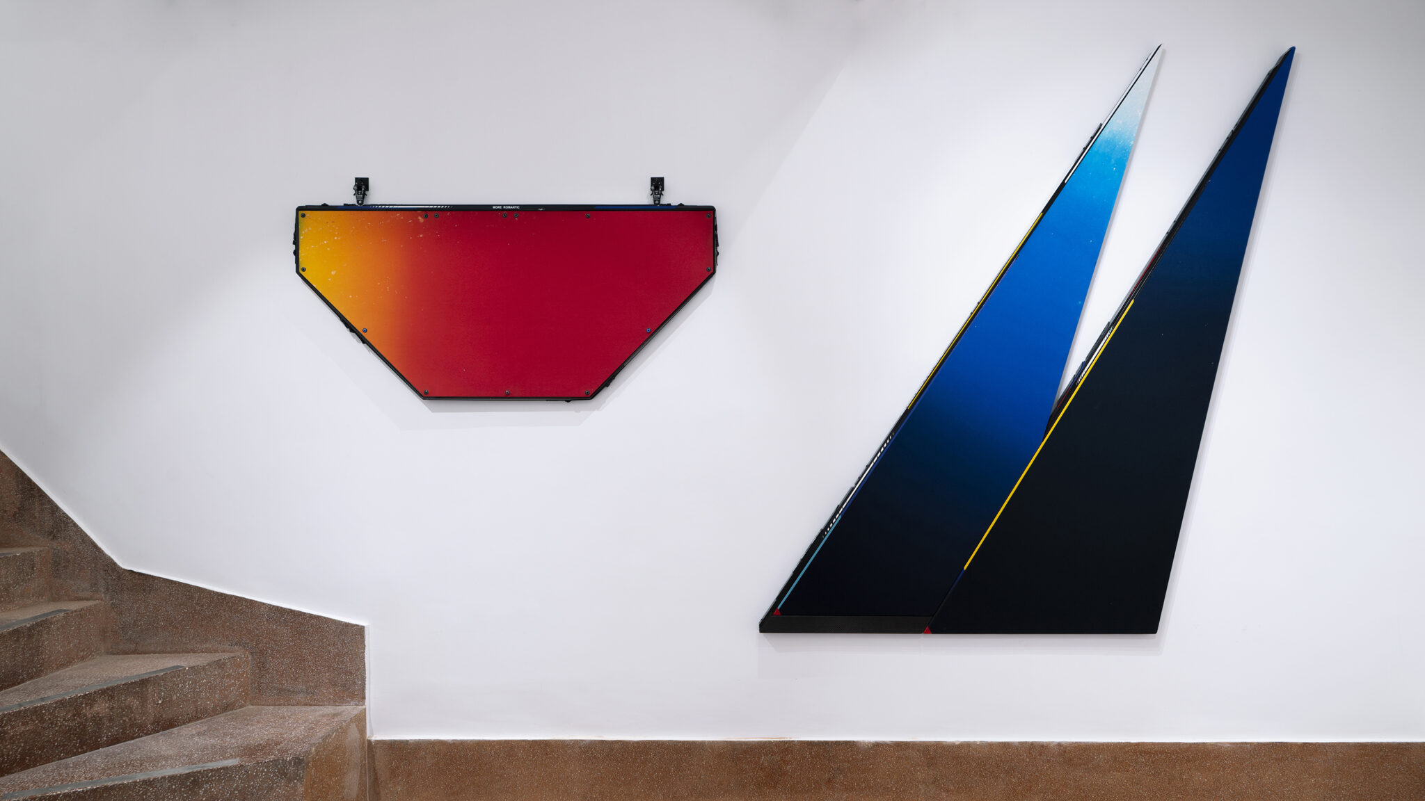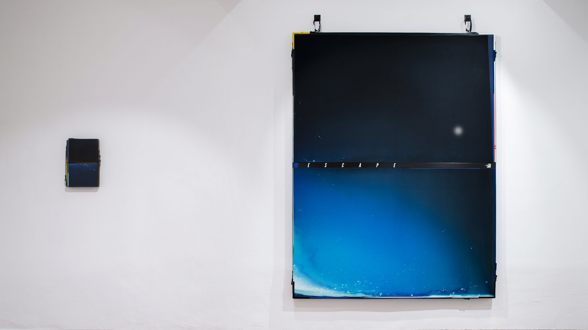 Grappling with contemporary manifestations of mythology and systems of belief, the work of Ben Edmunds is chiefly characterised by its combining the “holy” formal modes of Modernist Abstract Expressionism, colour field painting and Minimalism, with the highly stylised and contemporary accents of extreme sports and hi-tech fashion. Out of this synthesis of celebrated iconographies, Edmunds treads a precariously fine line between cliché and a sincere acknowledgement of human desire. Because desire here is undeniably a fundamental currency of the paintings; underwritten in the dyed canvases, the handmade carbon fibre components, the carabiners and short incidents of text, is an implicit understanding that we are unsatisfied – that as an artist and as a viewer, we approach the world around us impoverished and in need of moralising, rationalising sustenance. In an energetic environment of fashions and trends, of juice-clenses and cross-fit, Edmunds’ paintings appeal to the “desiring-body”, to the appetite of the consumer who needs experiences more than they need objects.