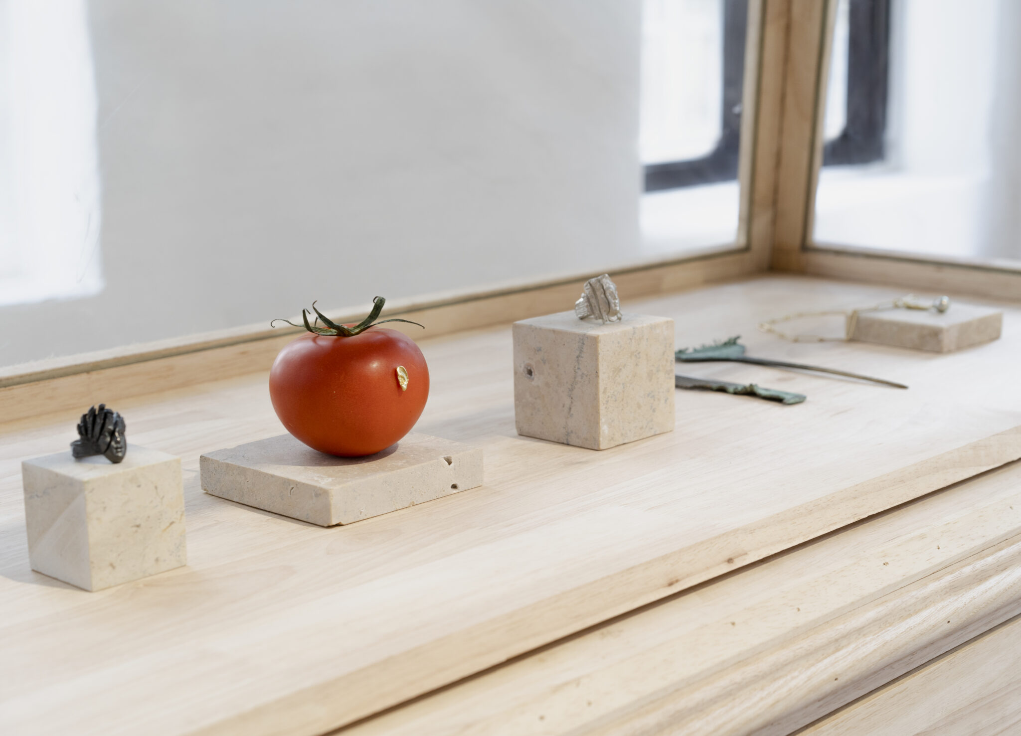 This joint exhibition tells a story of collaboration in the time of COVID-19; not only do Joy and Chris’s solo pieces sit side by side, enriching viewers’ reflections, they collide in the body of work produced by the artists together. After bring in contact for three years, discussing their artistic practice and the possibility of collaborating, Joy and Chris finally embarked on this collaboration in March 2020. In a slightly clandestine manner, Joy’s pieces found their way into Chris’s home, and subjected to his lens. Recruiting the most ‘mundane’ objects in his reach, juxtaposing them with Joy’s exquisite creations, Chris ended up discovering the kind of natural light he’d often sought to create was in his office all along. The result is Joy’s jewels represented in playful yet poignant still lifes which simultaneously mimic and mirror the genre.